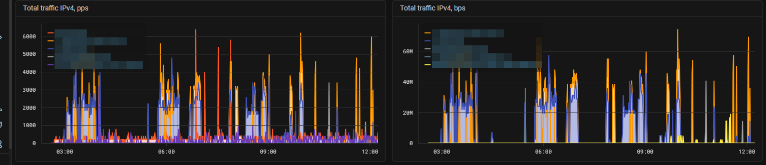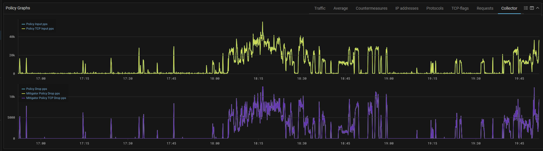 The graphs show traffic arriving at the collector marked as “dropped”, for example, when sending sFlow over dropped packets from MITIGATOR, or from other sources.