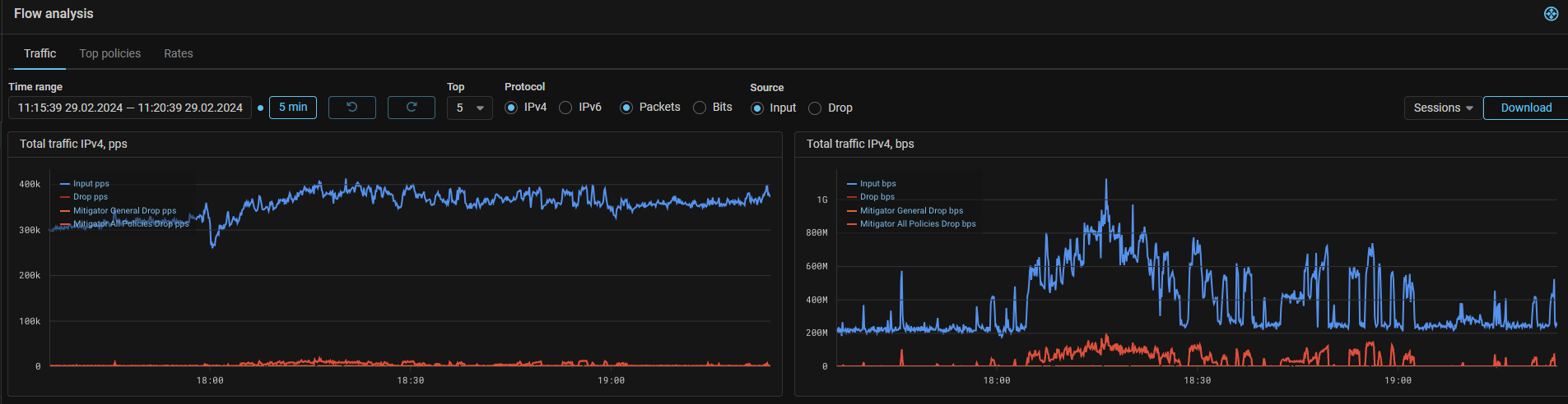 The curves of traffic dropped on MITIGATOR contain the word “Mitigator” in the name. Drops based on flow data from other sources are marked with the prefix “Other”. The “Drop” graph without prefixes in the name shows the total drop from all sources.