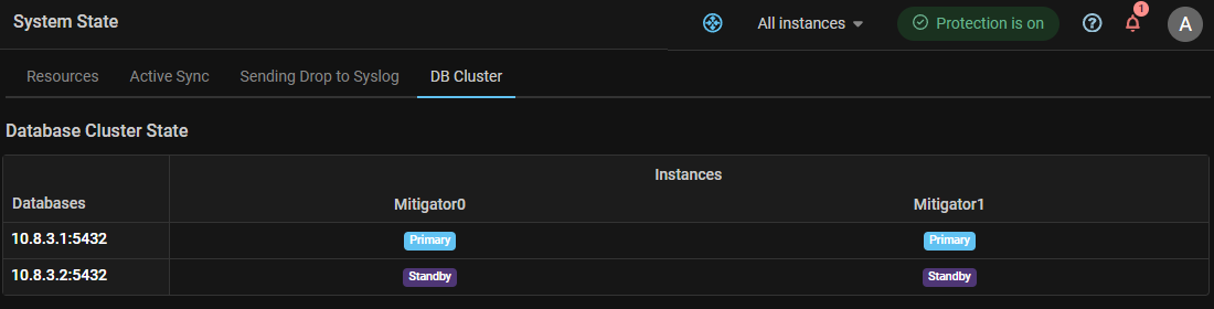 A DB Cluster tab added to the System State page, which displays information about the status of the database cluster. For each database, its role is displayed for each MITIGATOR instance with pgfailover active.