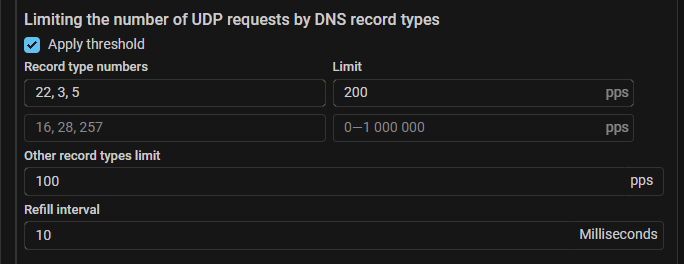 Added the ability to set a limit on the maximum number of UDP requests with certain numbers of DNS record types per second. Many restrictions can be set. Each restriction can specify multiple record types.