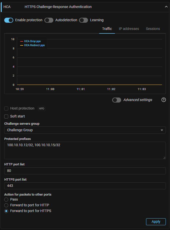 For the HTTP traffic processing scenario, the ability to specify separate ports for HTTP and HTTPS traffic added to the challenge server. Requests to the specified port numbers will be forwarded by the HCA countermeasure to the corresponding Web-challenger ports.