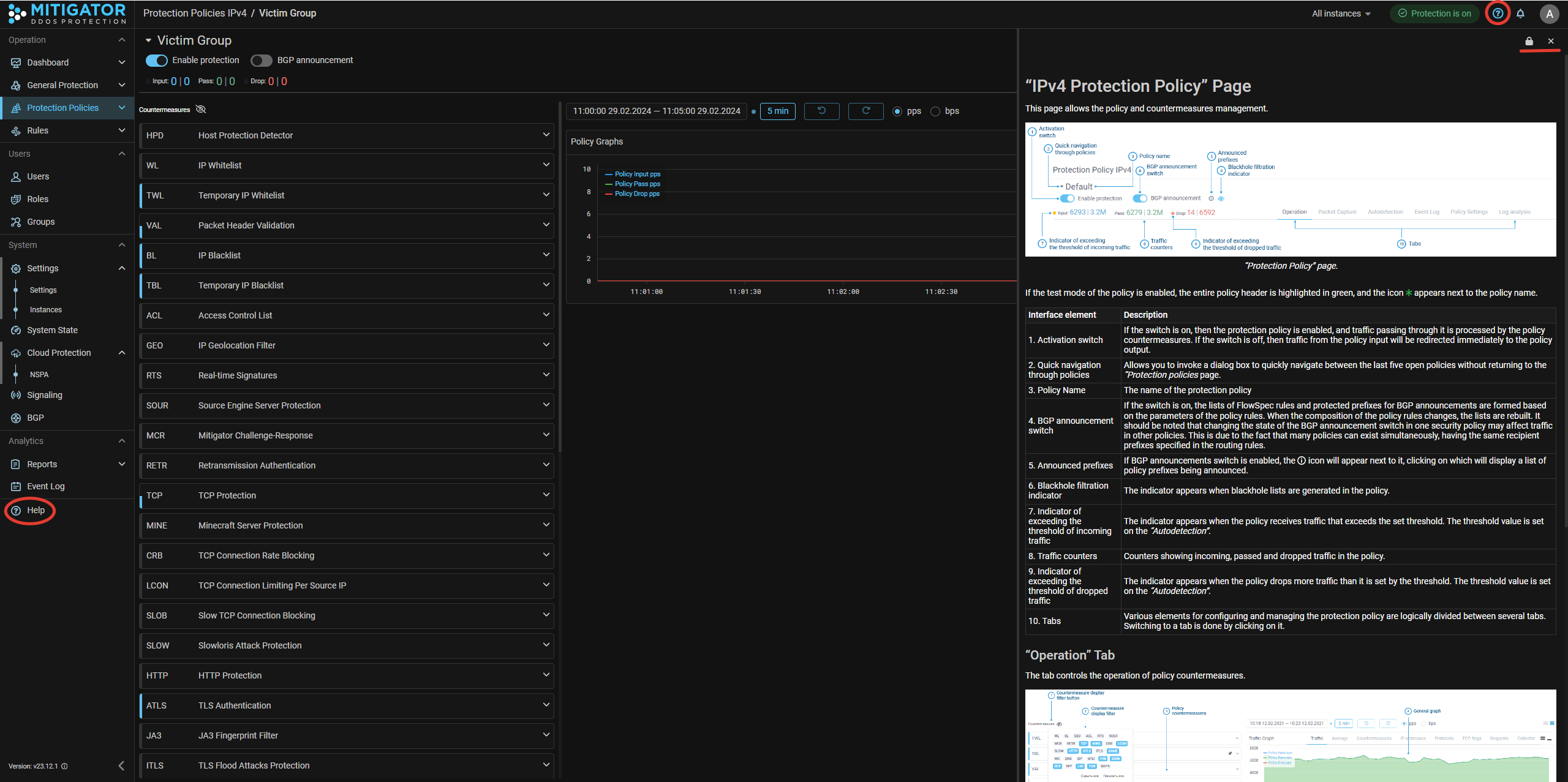 Now, without going to general help, you can see a description of the currently open page or tab. This is especially convenient for the Log Analysis and Flow Analysis tabs. Clicking on the question mark now opens not a complete help on the system, but only a description of the current page. General help has been moved to the main menu section. The size of the context-sensitive help window is customizable. The window can be firmly anchored to the page or shown only on hover. When switching between sections of the interface, the contents of the window change automatically.