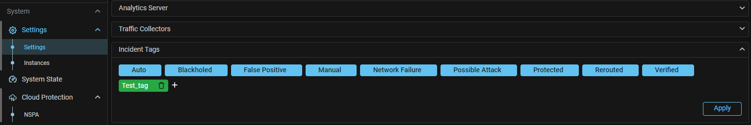 The “Incident Tags” card has been added to the “Settings” page. The panel allows to add, delete or change tags used to tag incidents. Only tags from the list can be assigned to an incident.