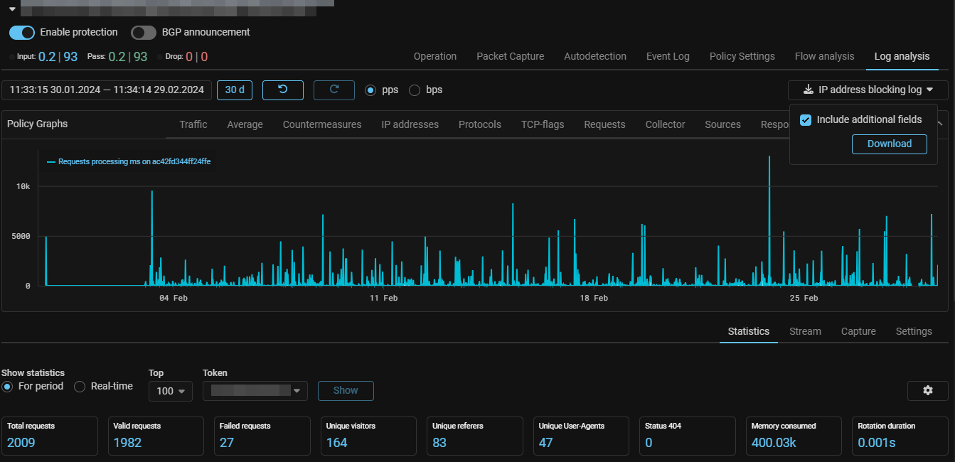 Now, on the “Log Analysis” tab, you can download the IP address blocking log with a block reason indication.