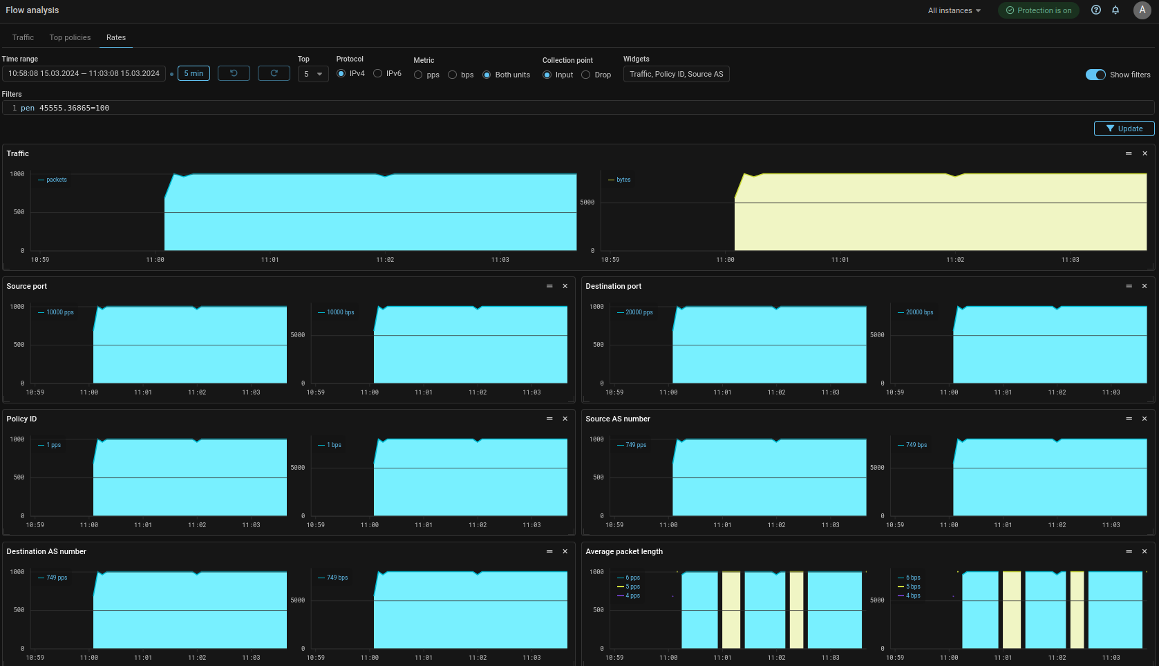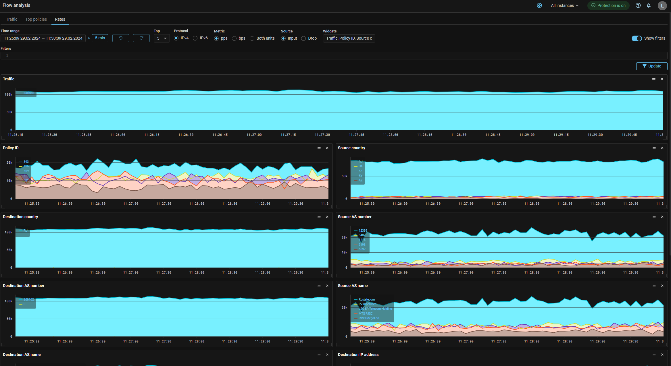 The “Rates” tab has been added to the “Flow Analysis” page, which displays data from the Collector in the form of graphs. The data is grouped by categories, the graphs for each category are displayed in separate widgets, for which the size and location on the page are configured. The display of each category is set by a flag. You can set a custom filter, in this case, only the data corresponding to the entered filter will be displayed on all graphs. There is a logical “And” between the lines. Thus, for example, you can plot the flow received from a specific source, or from a specific range of ports.