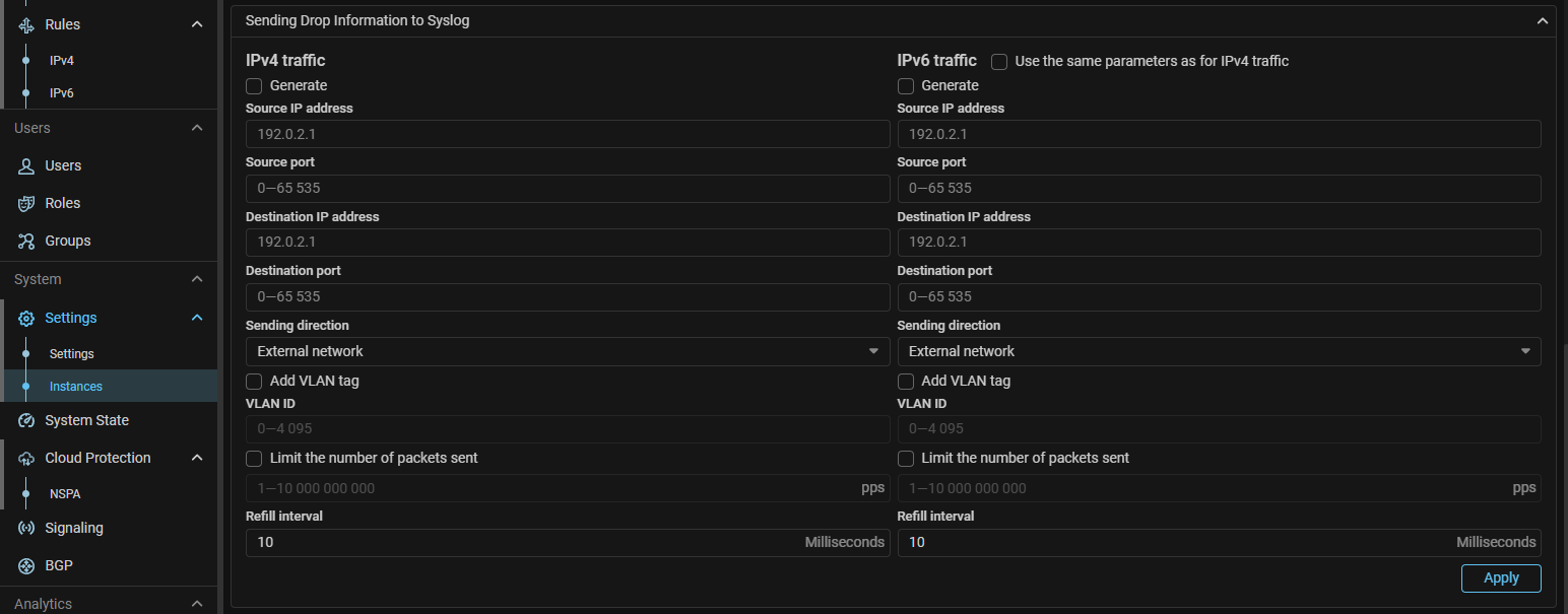 Syslog. Added the ability to specify the destination MAC address in the parameters for sending syslog with information about drops.
