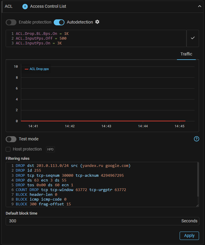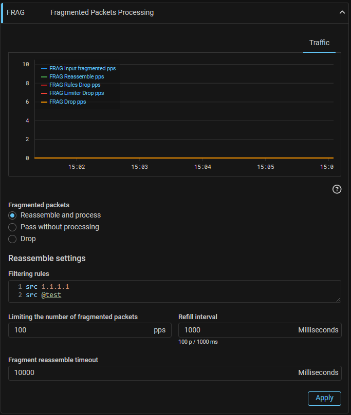 Now reassembly can be applied not to all incoming packets, but only to those that match the specified rules. All other packets will be dropped. This allows processing only legitimate fragmented traffic, if it is present in the protected network. The syntax of the rules is similar to the ACL countermeasure, but does not contain any action on traffic. The L4 header is contained only in the first fragment, this should be taken into account when writing rules.