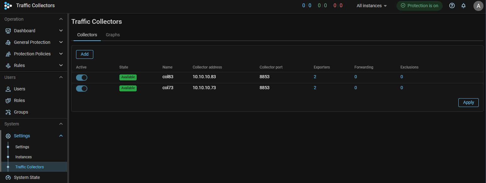 Collector. The settings for traffic collectors are placed in a separate item in the main menu.