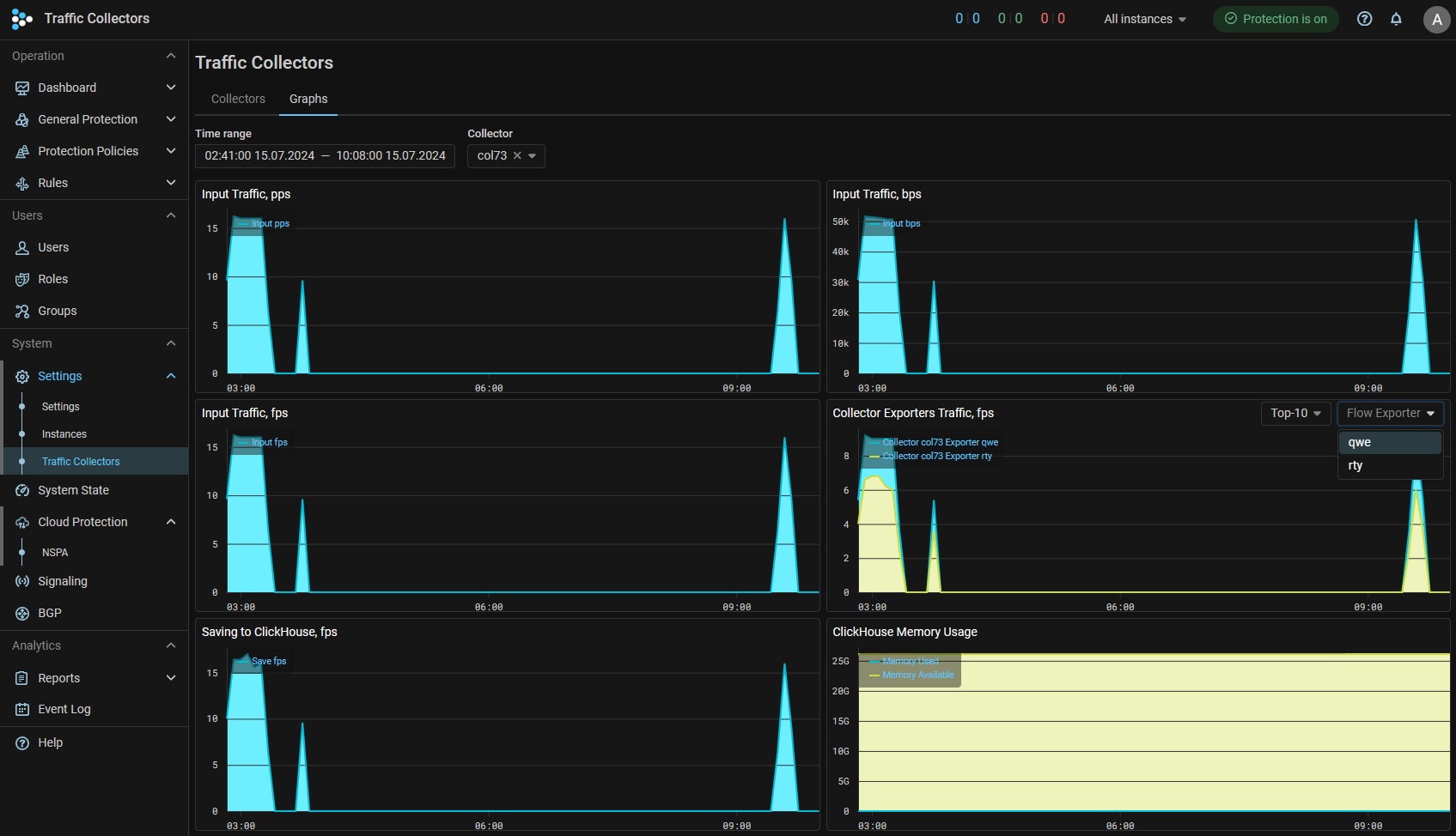 Complex speeds have been added on the “Dashboard” tab of the “Flow Analysis” page and on the “Flow Analysis” tab in the protection policy: