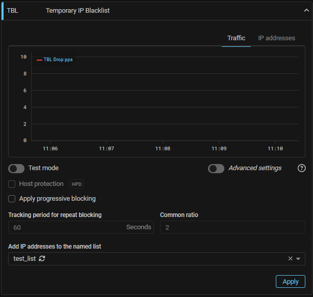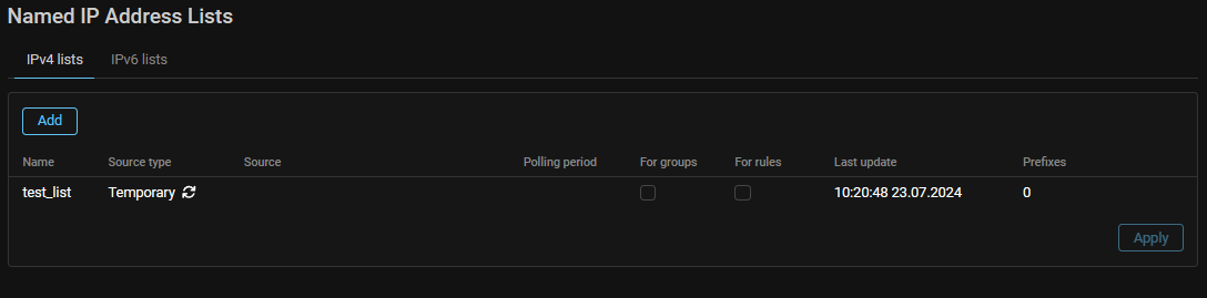 Now for named lists of IP addresses filled from TBL, you can select “Temporary” source type. IP addresses will only be on this list for as long as they are in the TBL. When an IP address leaves the TBL, it will be removed from the named list. If an IP address is blocked by several TBLs at the same time, for example in different protection policies, it will be removed from the named list when it exits all. The algorithm for filling lists with the “Input” type from TBL is left unchanged.
