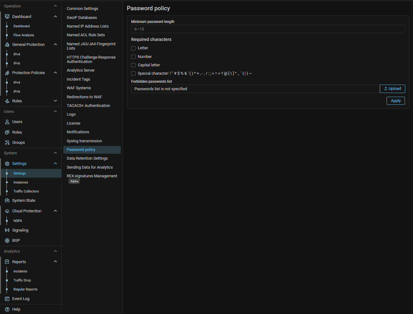 interface in the OS, interaction via SNMP, support for JA4 fingerprints, password policy