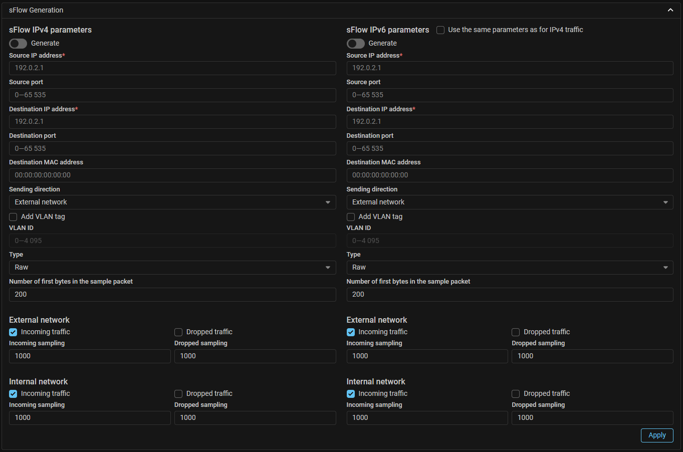 Now sFlow sending settings for IPv4 and IPv6 are displayed on the same tab. Also added the ability to apply uniform sFlow sending settings regardless of the IP protocol version, similar to sending information about drops via syslog.