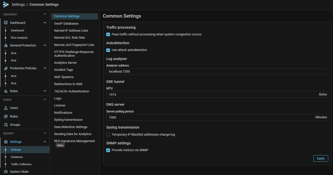 Now MITIGATOR can send metrics via SNMP. For the mechanism to work, you need to enable sending in the “Common Settings” panel of the “Settings” page.