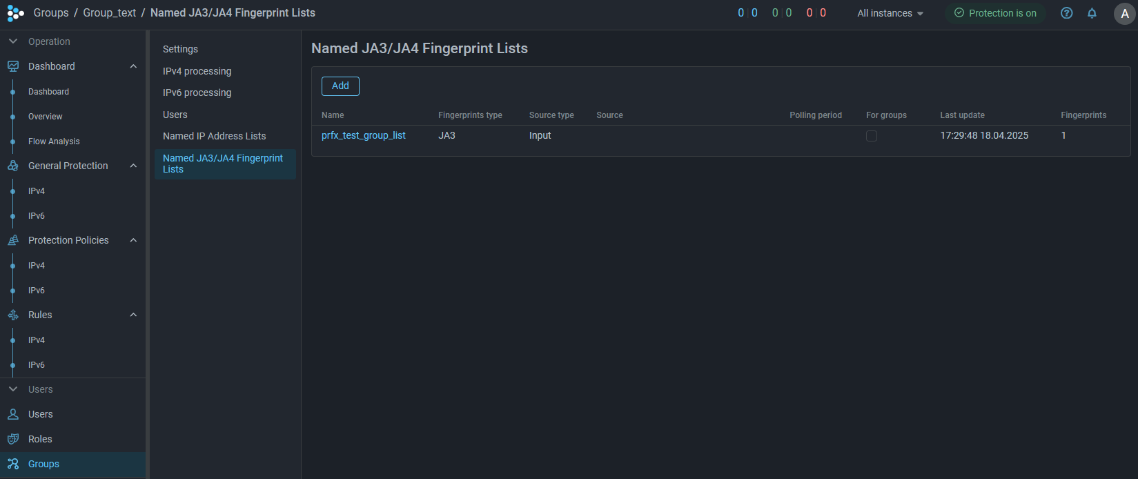 Now on the Group page, in the Named JA3/JA4 Fingerprint Lists submenu item, group users can create named fingerprint lists and independently manage their contents.