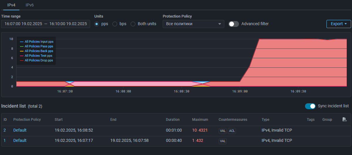 A table of average and maximum traffic dropped by each countermeasure during the incident has been added to the exported incident report.