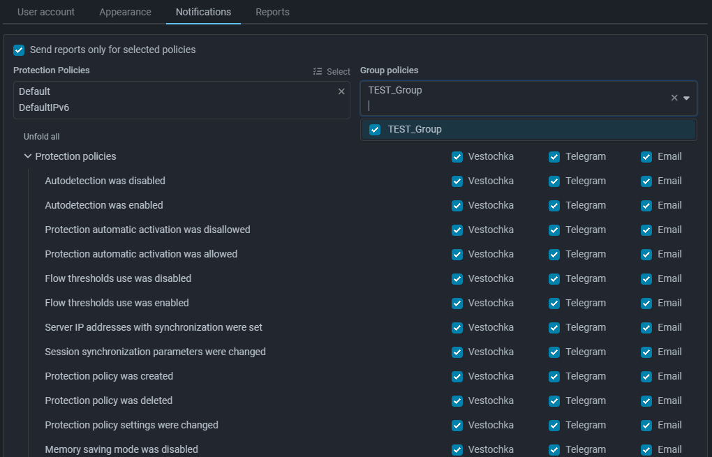 Now, when configuring event notifications on the user page, you can select a group. In this case, the user will receive notifications only about events in the protection policies belonging to this group.