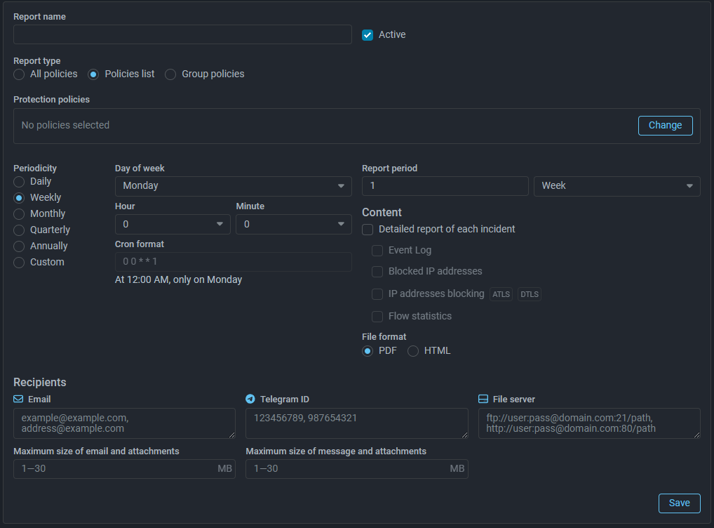 - send a file with a report to Telegram chat with the ID specified in the user profile;