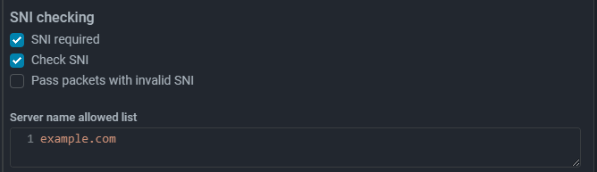 Added a mechanism for checking and filtering the contents of the SNI extension. Checks are performed to ensure that the SNI contents comply with the RFC 6066 requirements and the list of allowed domain names, if specified.
