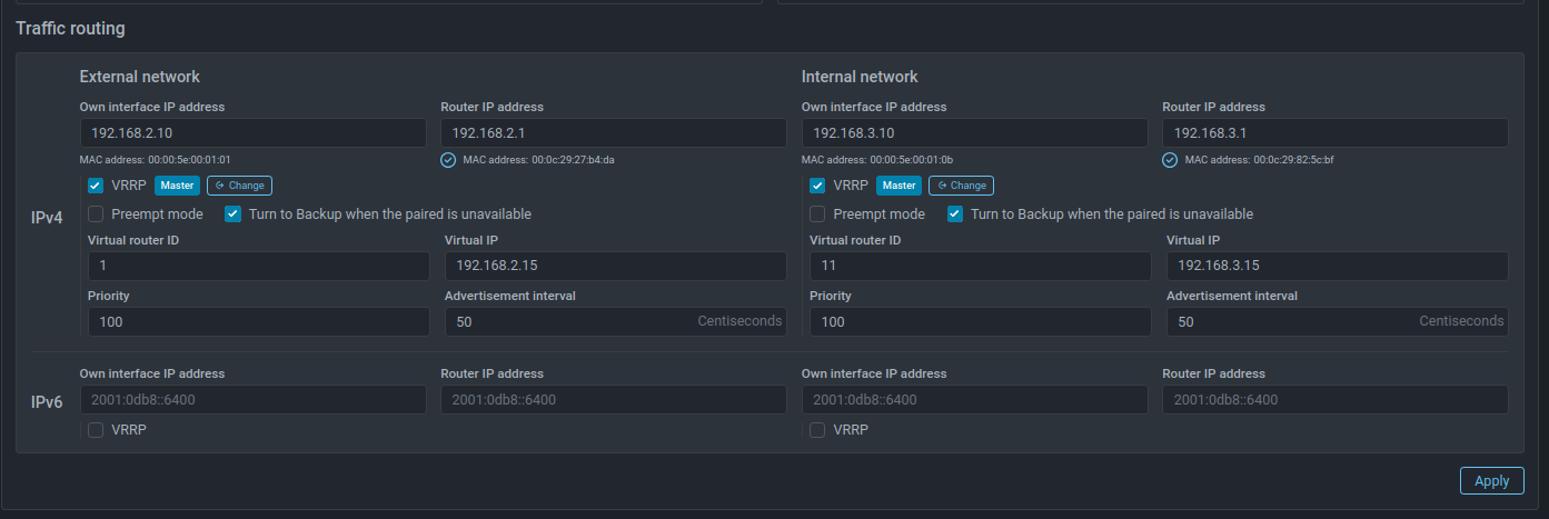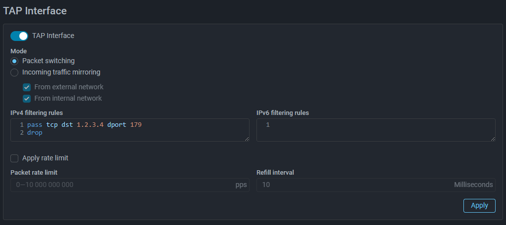 Added an operating mode in which incoming traffic from external and internal networks can be mirrored to the TAP interface.