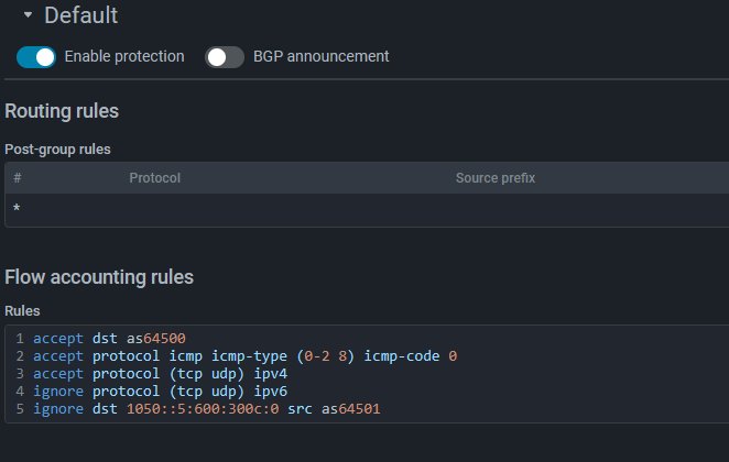 Now in the protection policy, using FlowDesc rules, you can describe which flows should be processed (accept) and which ones should be ignored (ignore) in counters and detection.