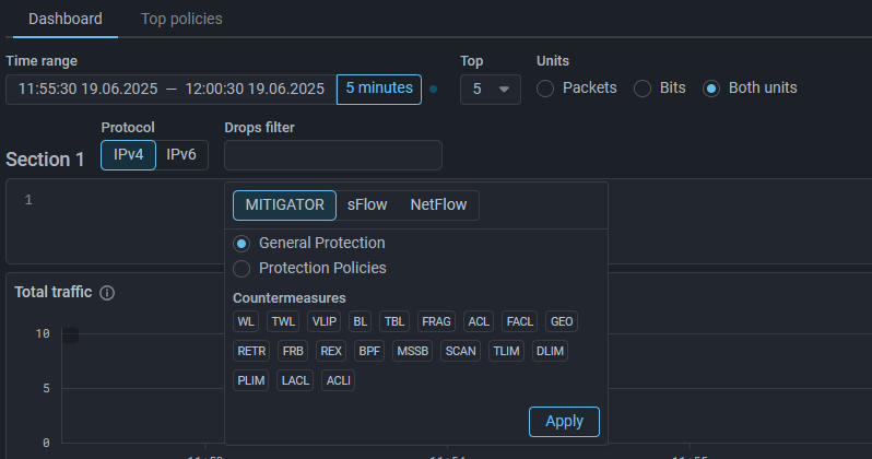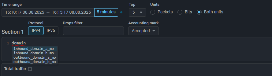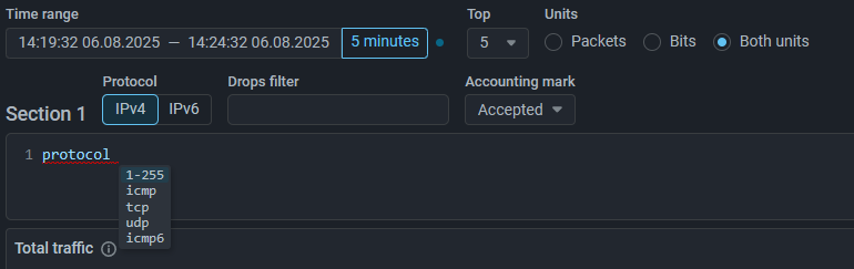 On the Flow Analysis page and on the Flow Analysis tab in the protection policy, the window for selecting filters for flow on drops has been changed. Now the setting is performed directly in the filter field without an additional modal window.