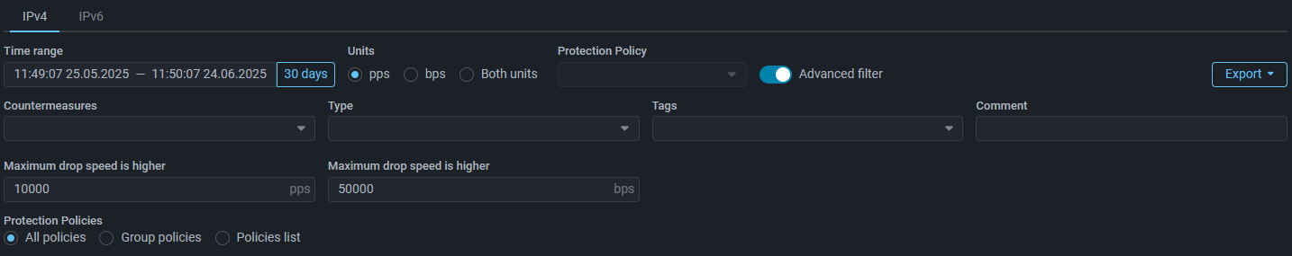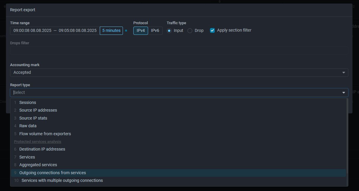 Export of reports with analysis of protected services in various criteria is performed in the same place where data on sessions, source IP addresses, Flow volume from exporters and other reports that existed earlier are downloaded. For ease of use, the selection of the downloaded report is now performed not in the drop-down list, but in a modal window.