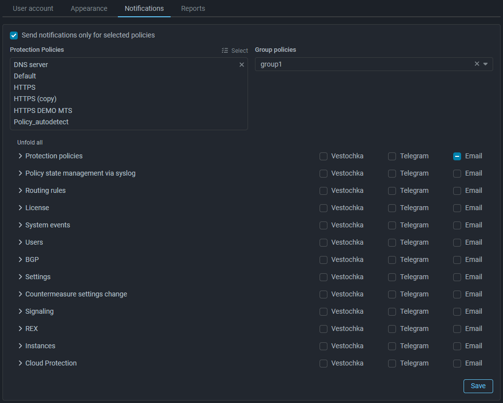 Now, in the user profile, you can specify not only the protection policies for which you want to receive notifications, but also select a group. In this case, the you will receive notifications about events from all protection policies belonging to the selected group.