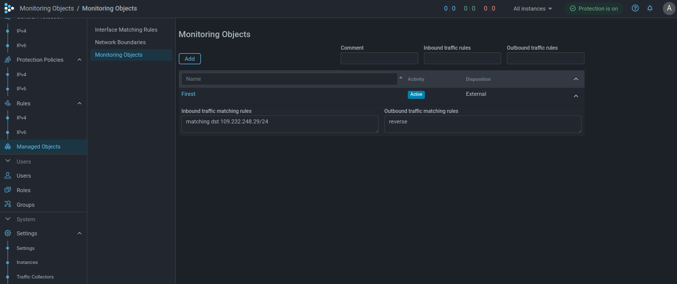 - flow can be associated with only one protection policy, but with several monitoring objects. For example, different monitoring objects describe AS, a prefix in it, a host and a service, then the traffic of the connection to the service can be taken into account in all four monitoring objects;