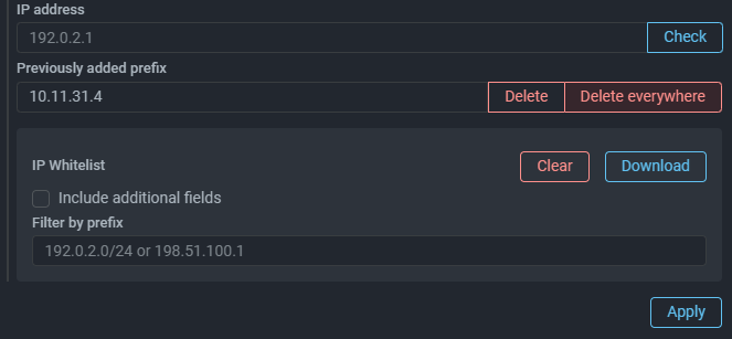 Some countermeasures have the functionality of checking whether an IP address is included in a list or table. Now, the pop-up message that appears when you click the Check button displays not only information about the presence of an IP address in the list, but also an indication of cluster instances.