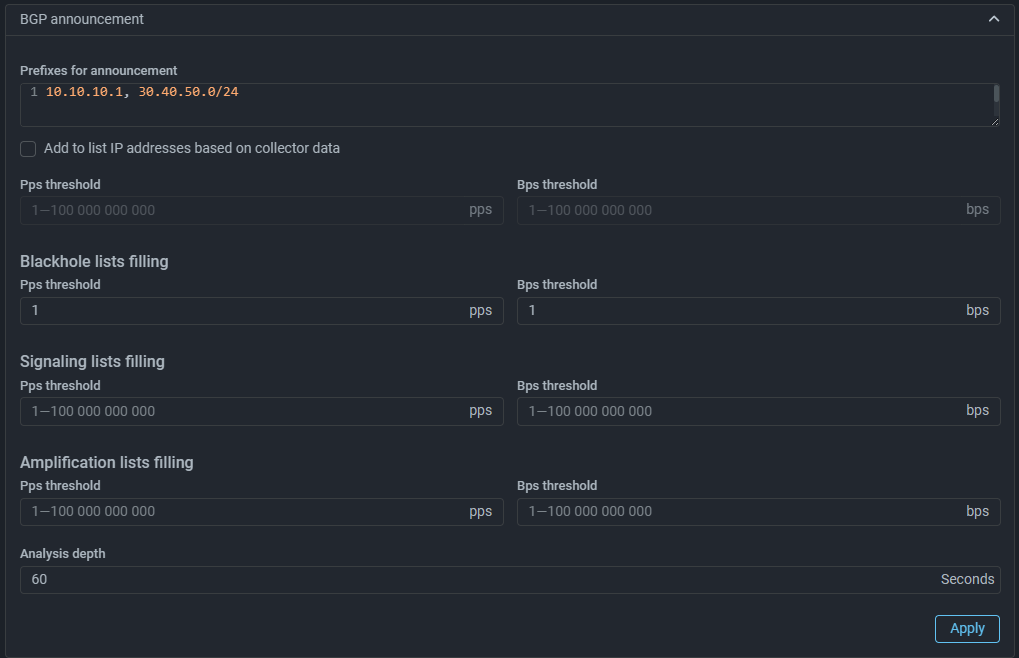 The thresholds apply to ACL, BGP.Announce, BGP.Blackhole, BGP.Signaling, Type1.