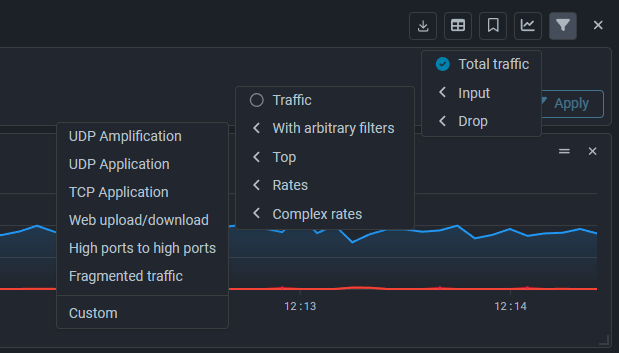 Widgets titled «With arbitrary filters» have been added to Flow Analysis. These widgets allow to place multiple curves on a single chart, with each curve corresponding to a specified filter.