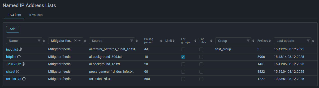 Fields for entering filters have been added to the headers of IP addresses, TLS fingerprints, and rule sets named lists (both system and group ones). Case is irrelevant. Filtering can be performed across multiple columns simultaneously. Also sorting has been added.