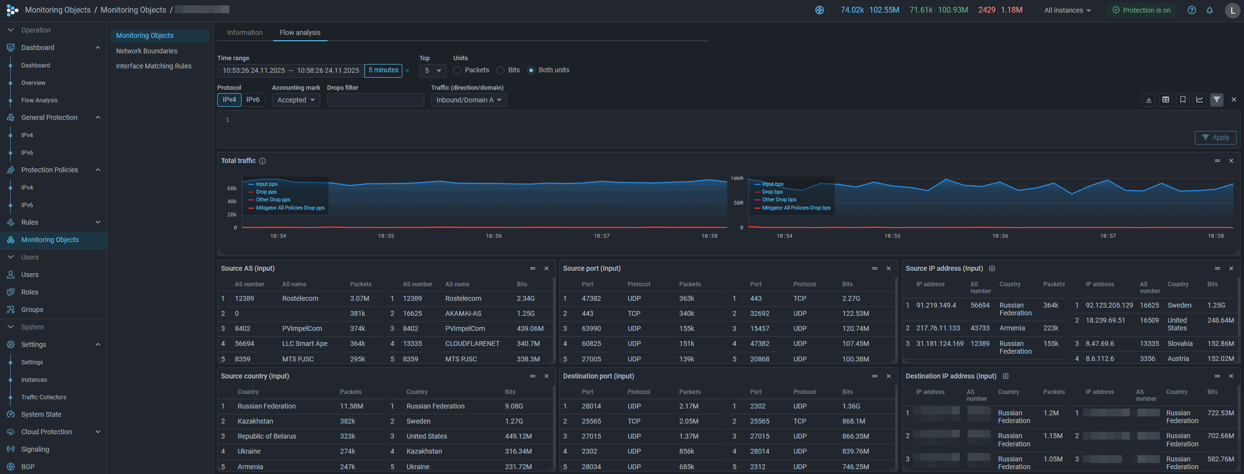 The «Monitoring Object» page now includes a «Flow Analysis» tab, which is identical to the «Flow Analysis» available in monitoring and on the protection policy page.
