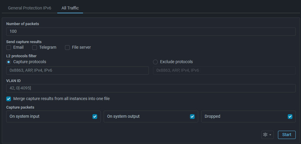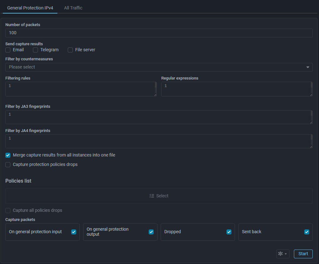 On the «General Protection» tab, traffic processed by the system is captured— that is, IPv4/IPv6 protocol traffic entering general protection.