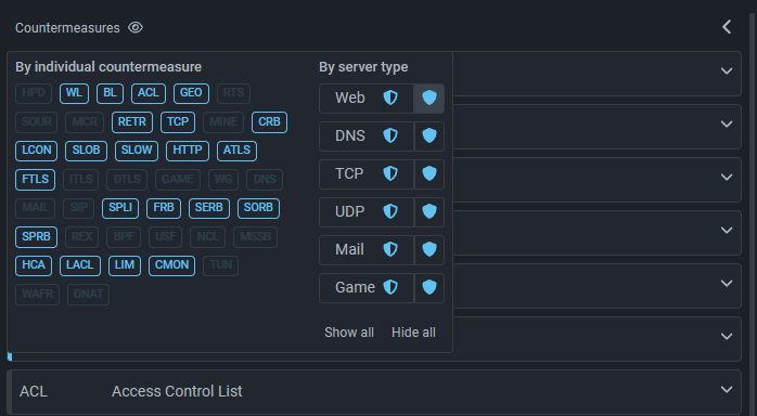 Now, when you click the filter button, predefined display sets become available for selection — organized by the type of service protected under the policy. Applying a set hides all countermeasures except those that are most effective for protecting that particular type of service. Countermeasures that are enabled or in autodetection mode are not hidden. For all services, both a basic and an advanced set of countermeasures are available.