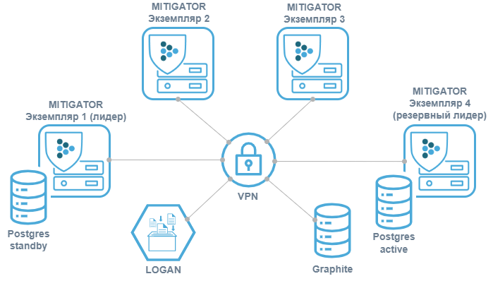 но количество реплик БД меньше, чем количество экземпляров MITIGATOR в кластере.