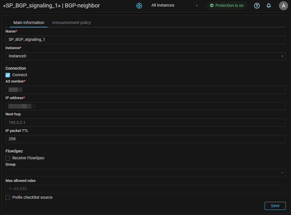 В настройках соседа задаются его сетевые параметры. Следует указать большое значение TTL IP-пакета, так как BGP-спикер MSSP может находиться на удалении.