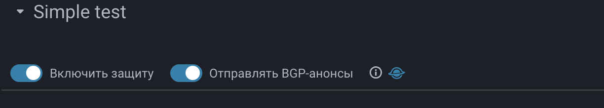 О наполнении blackhole-списков префиксами политики сигнализирует индикатор, появляющийся рядом с переключателем «Отправлять BGP-анонсы» на странице «Политика защиты».