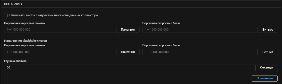 Порог BGP.Announce.Flow.Arms.InputPps.On = 1 наполнит стандартные списки значениями