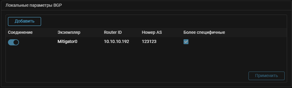 В локальных параметрах BGP-соединения экземпляров MITIGATOR1 и MITIGATOR2 установлен