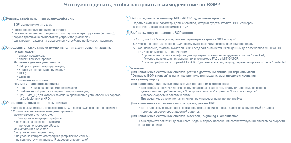 MITIGATOR может использовать взаимодействие по BGP в сценарии сигнализации вышестоящим операторам связи или поставщикам услуг защиты.