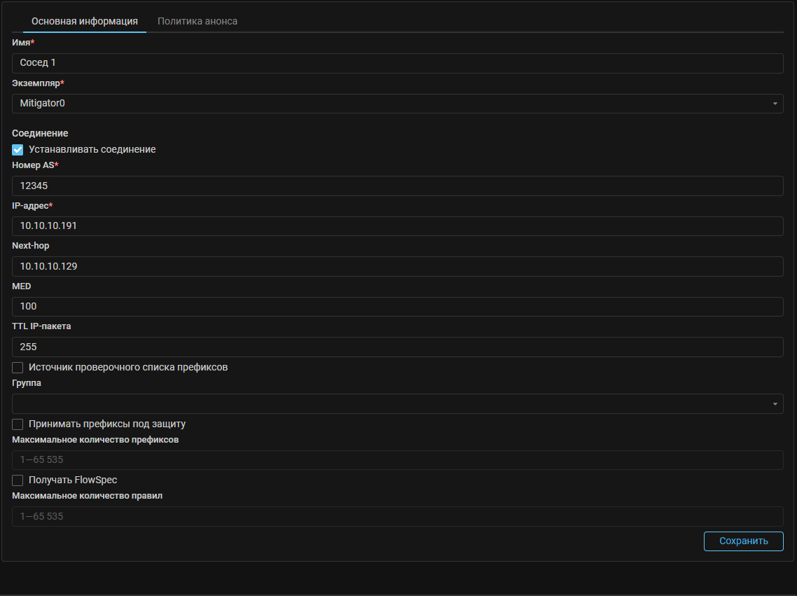 При создании в системе BGP-соседа указывается, какой экземпляр взаимодействует с соседом, сетевые параметры соседа, nexthop, сообщаемый при отправке BGP-анонса, и другие параметры. Поддерживается атрибут MED, определяющий приоритет маршрута следования трафика от BGP-соседа на экземпляр MITIGATOR. При наличии нескольких равноправных маршрутов будет выбран маршрут с наименьшим значением MED.