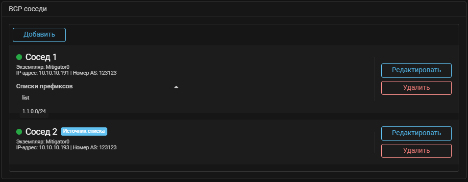 Экземпляры MITIGATOR могут устанавливать BGP-соединение с другими устройствами сети, каждое из которых задается в системе как BGP-сосед. Любой из экземпляров может соединяться с одним или несколькими соседями.