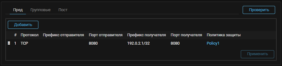 Например, в MITIGATOR задано правило маршрутизации, ведущее на политику Policy1: