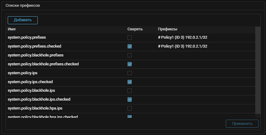 с проверочным списком, полученным от BGP-соседа. У системных списков сверяемыми