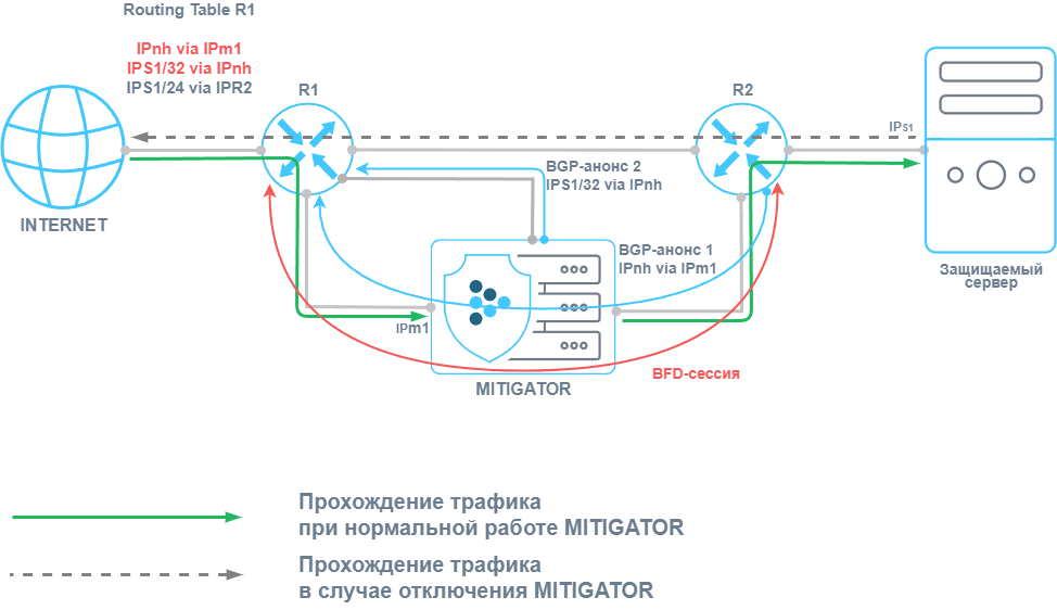 В вышеописанной схеме в случае нештатного отключения сервера с MITIGATOR снятие BGP-анонсов займет некоторое время, в течение которого R1 продолжит отправлять трафик на MITIGATOR, что приведет к потере этого трафика. Для минимизации времени обновления маршрутов можно использовать протокол BFD.