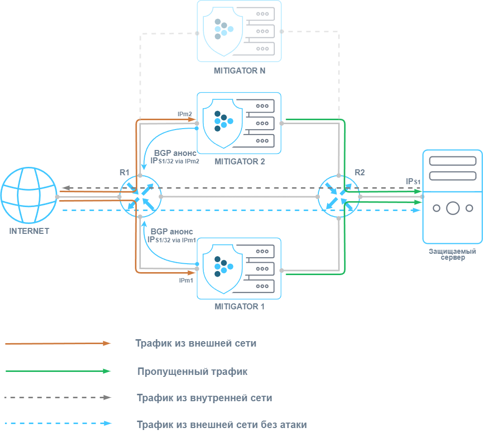 Таким образом, при отсутствии необходимости защиты трафик на защищаемый ресурс поступает напрямую от R1 к R2, минуя MITIGATOR. В момент, когда необходимо активировать защиту, экземпляры MITIGATOR отправляют на R1 BGP-анонс, сообщающий, что защищаемый префикс IPs1/32 доступен через IPm1 и IPm2. За счет балансировки по ECMP трафик будет распределяться между двумя устройствами.