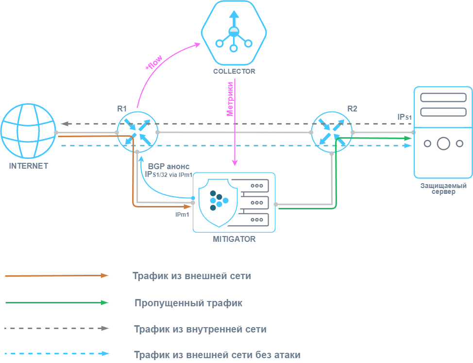 Если при отсутствии атаки трафик не проходит через MITIGATOR, то для детектирования требуется получение телеметрии по трафику от сетевого оборудования. Телеметрия с вышестоящего роутера передается на Collector по flow-протоколам. Collector передает статистику по трафику на MITIGATOR. Автодетектирование в MITIGATOR, зафиксировав аномалию, отправляет BGP-анонс для перенаправления трафика на очистку.