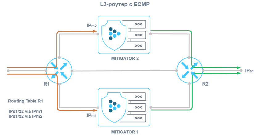 Для способа внедрения L3-роутер возможна балансировка трафика между экземплярами MITIGATOR с помощью ECMP.