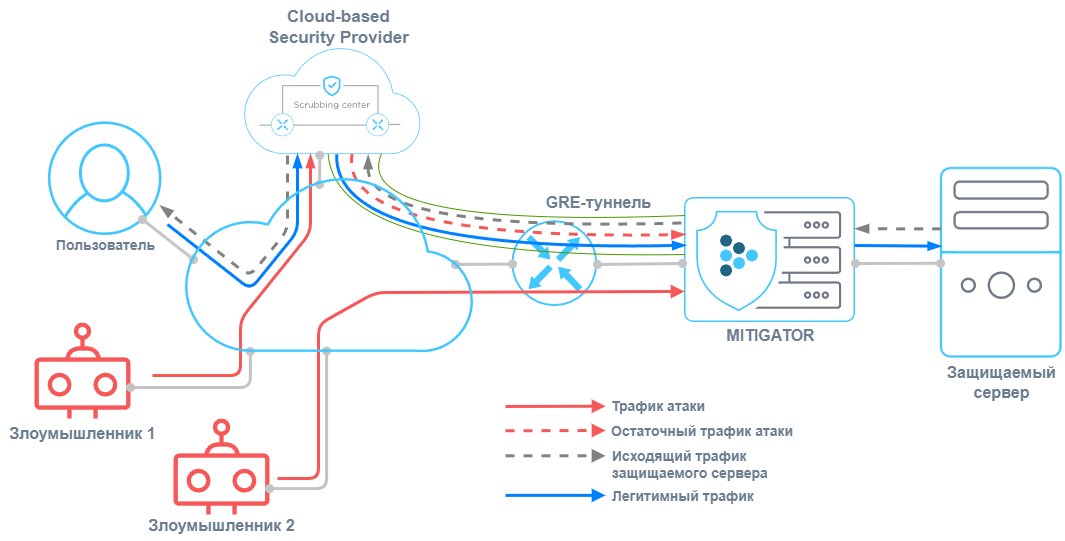 Поставщик оказывает услугу потребителю, который находится за пределами его сети, либо доставка очищенного трафика до защищаемого ресурса осложнена особенностями маршрутизации в сети поставщика. В этом случае трафик поступает на MITIGATOR из внешней сети, подвергается очистке, после чего запаковывается в GRE-туннель и отправляется на защищаемый ресурс во внешнюю сеть. Исходящий трафик защищаемого сервера может упаковываться в GRE-туннельили направляться напрямую пользователю через Internet.